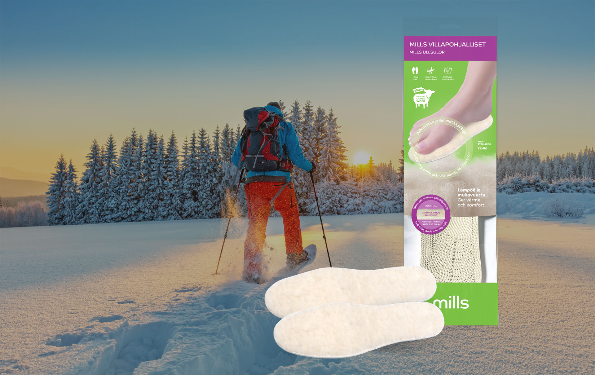 Talven ulkoiluaktiviteetteihin erinomaiset Villapohjalliset ovat eristävät ja pehmustavat. Niissä on lämmin ja muhkea 100 % lampaanvillakerros. Sopii kaikkiin jalkineisiin. Villakerroksen alla oleva lateksinen anti-slip pohja tuo pitoa ja pehmentää askellusta. Nyt ostoedulla!